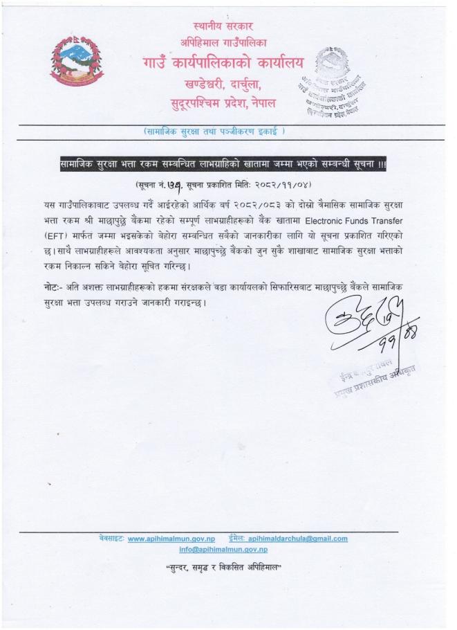 सामाजिक सुरक्षा भत्ता रकम सम्बन्धीत लाभग्राहिको खातामा जम्मा भएको सम्बन्धी सूचना