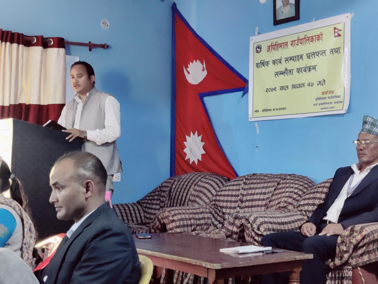 अपिहिमाल गाउँपालिकाको वार्षिक कार्य सम्पादन छलफल तथा समझौता कार्यक्रम विच गा.पा. अध्यक्ष संग प्रमुख प्रशासकीय अधिकृत विच र प्रमुख प्रशासकीय संग शाखा प्रमुख विच आ.ब. २०७९-८० को लागि कार्य सम्पादन सम्झौता सम्पन्न भयो ।