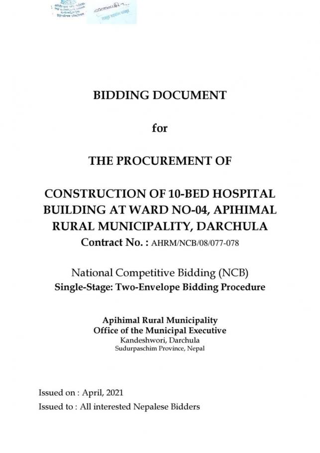 Construction of 10 bedded hospital in Apihimal Rural-Municipality Bid Notice १० सैया अस्पताल निर्माण अपिहिमाल गाउँपालिका वडा नं ४ बोलपत्र आह्वान सम्बन्धि सूचना